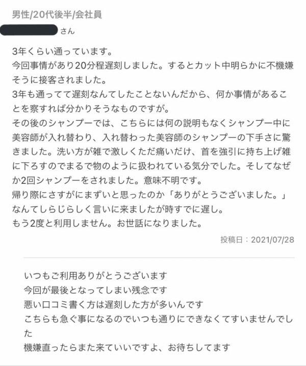 こんなん明らかに難癖なんやから放っておけばいいのに相手したら美容師の評価下がるだけやん