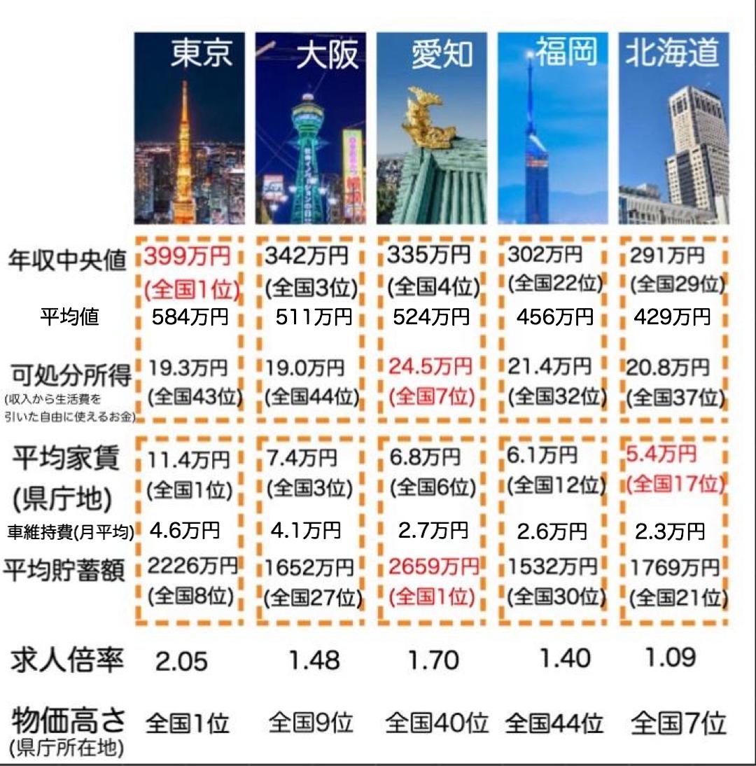 ・賃金が高くても家賃や生活費が高いため可処分所得は全国最低レベル。趣味に金使えない極貧生活。